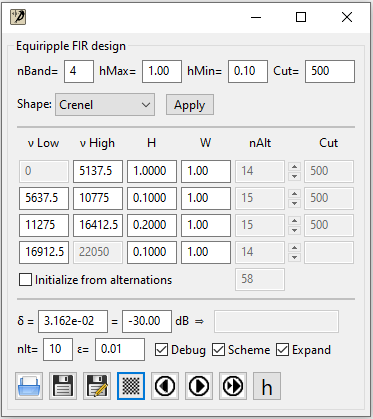 If Initialize from alternations is checked, you can define the number of alternations for the initial solution. In that case, target δ is ignored and the entry is grayed out. The number of alternation is derived from the Kaiser approximation available for a 2 bands filter nAlt=(-20 log10(δ) - 13) ∕ (2.324 * cutoffWidth).
