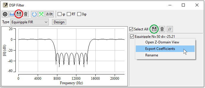 Right click on any DSP filter in the right panel and select Export coefficients