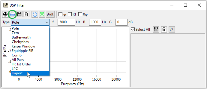 Selecting Import as filter type opens a file chooser dialog box that allows you to select the input file. Available extensions are .dsp for binary files and .dspa for ascii files.